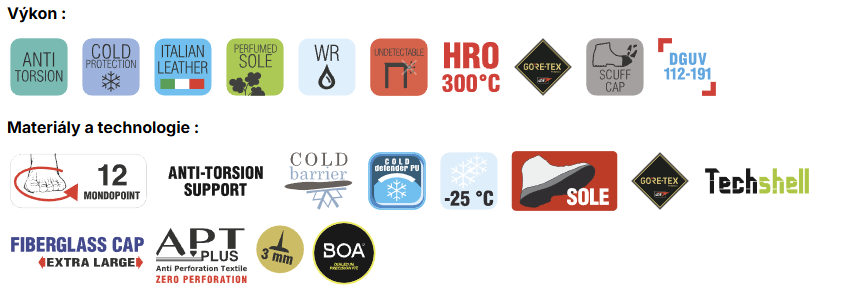 | Speciální vlastnost: | Absorpce energie v oblasti paty, Izolace proti chladu, Nepromokavé, Odolnost proti oleji, Ochranná špice 200J, Protiprůrazová mezipodešev, Protiskluzové, Tepluodolné, Uzavřená pata |