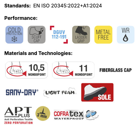 | Speciální vlastnost: | Absorpce energie v oblasti paty, Nepromokavé, Ochranná špice 200J, Podešev odolná kontaktnímu teplu, Podešev odolná olejům, Protiskluzové, Uzavřená pata |