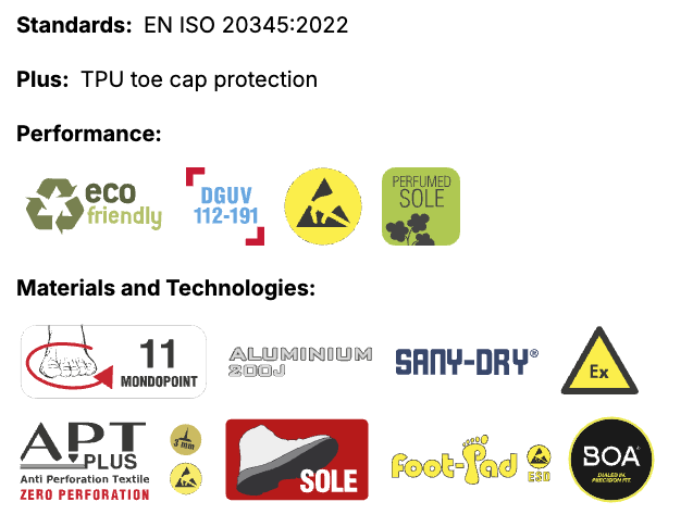 | Speciální vlastnost: | Absorpce energie v oblasti paty, Antistatické, Ochrana před elektrostatickým výbojem, Ochranná špice 200J, Protiprůrazová mezipodešev, Protiskluzové, Uzavřená pata |
