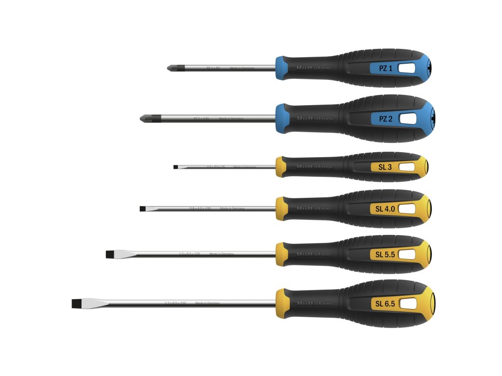 Barva rukojeti a jasně vyznačená velikost jasně udávají druh a velikosti šroubováku. Design šroubováku umožňuje maximální přenos vynaložené síly. Ergonomická rukojeť s protiskluznou úpravou pro spolehlivý úchop. Tvar rukojeti zabraňuje skutálení. Díra v rukojeti pro zavěšení. 2 kusy křížových (Pozidriv) a 4 kusy plochých šroubováků.Doplňkové parametry